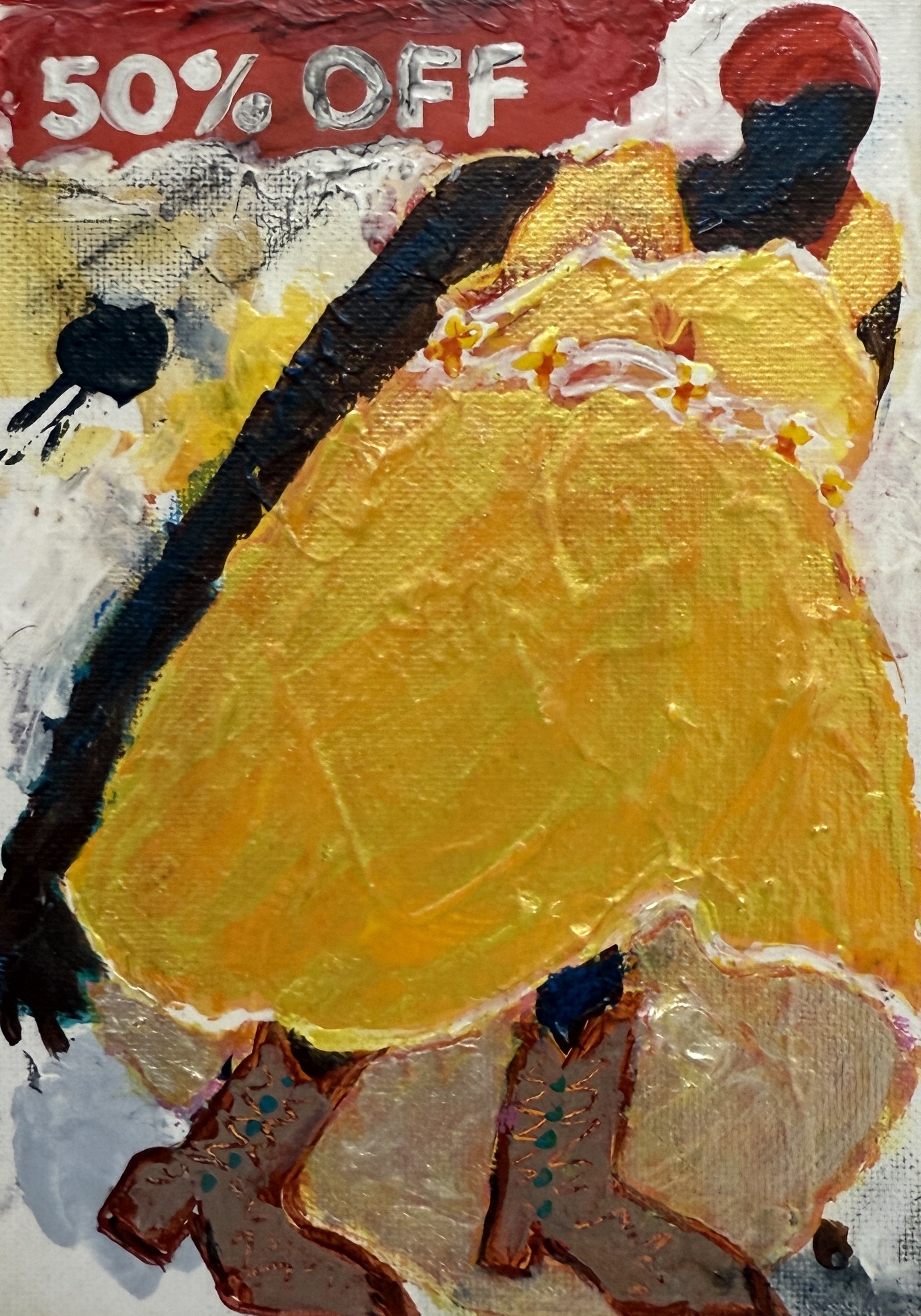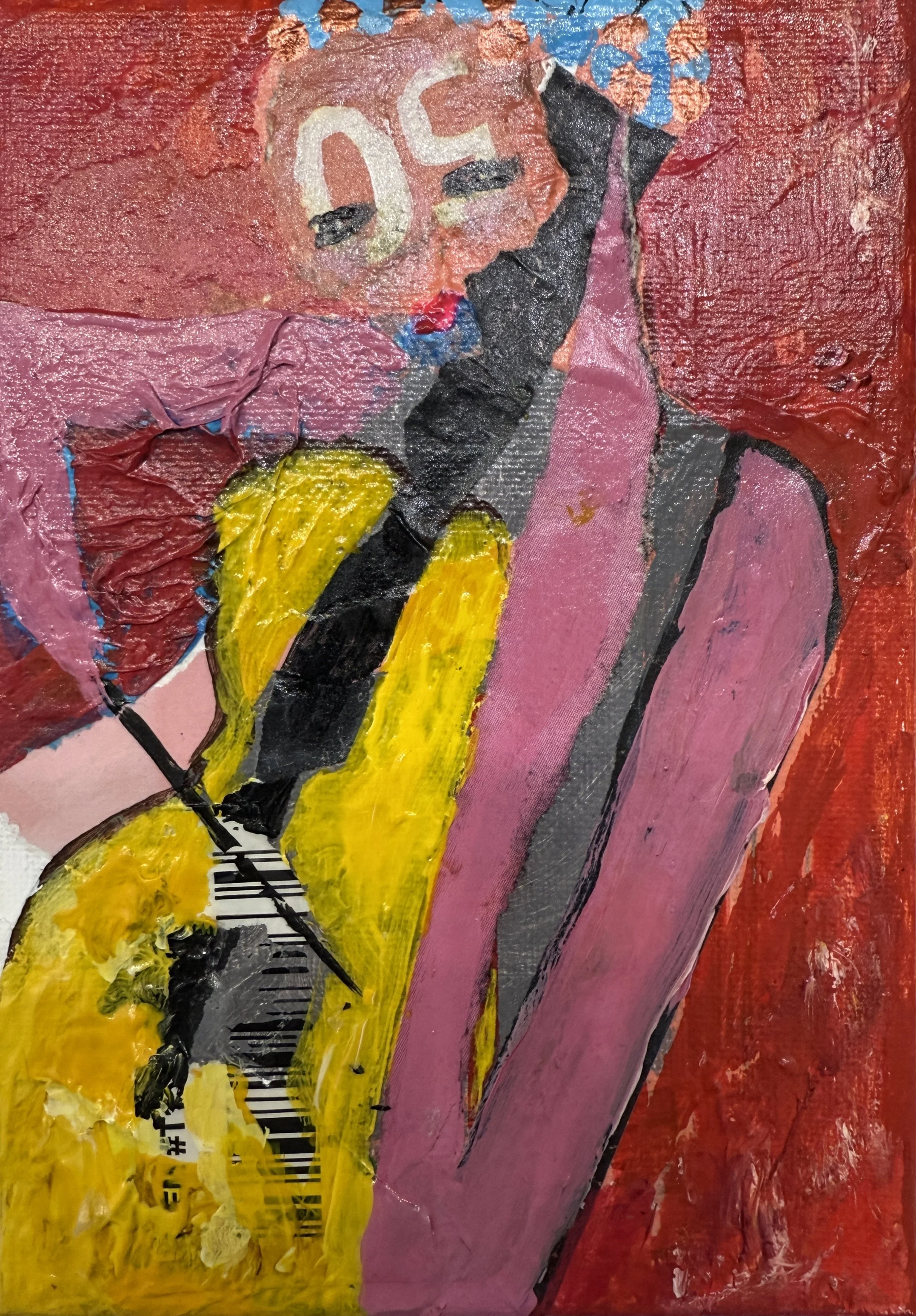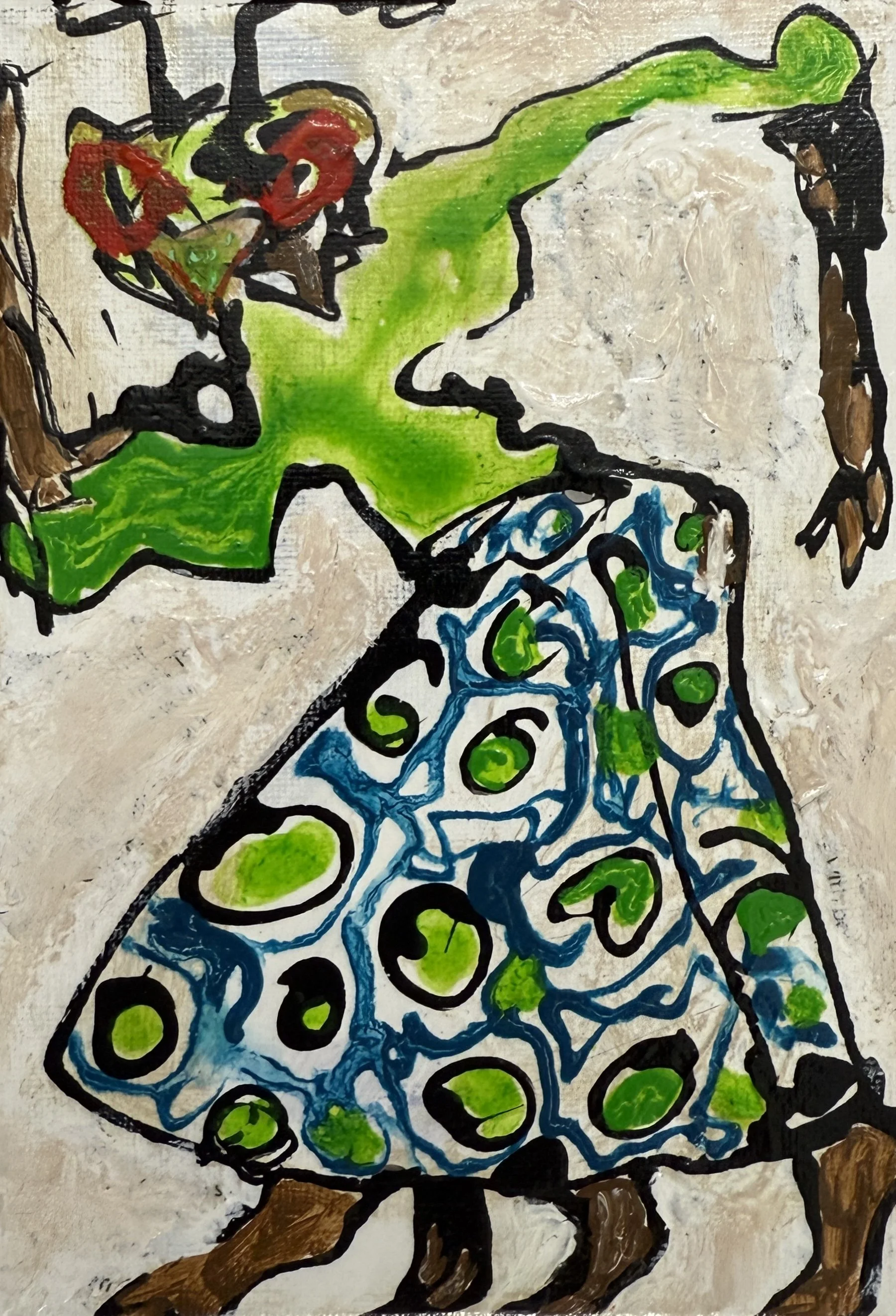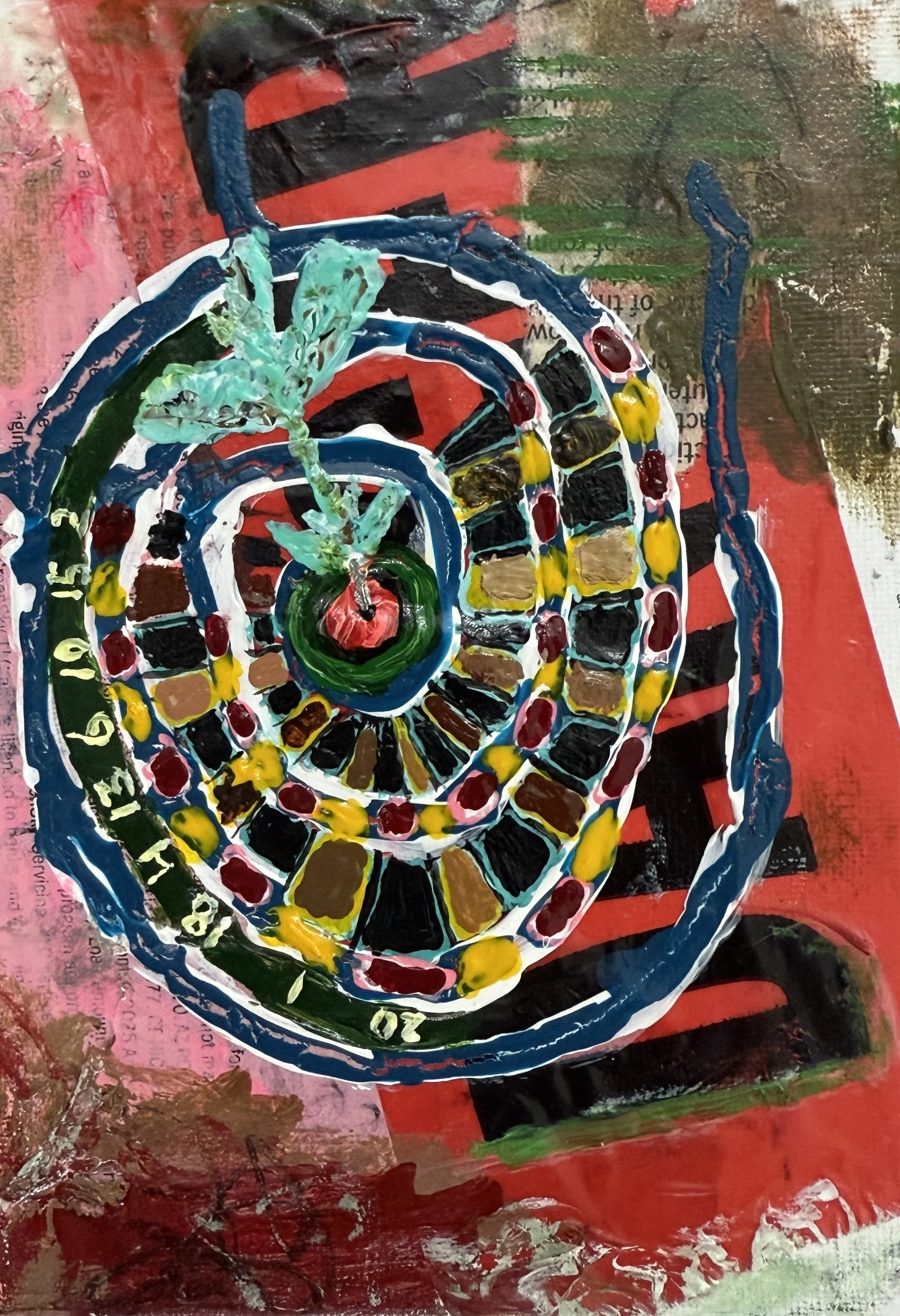 Whether you say “pockuhbook” or “pocketbook”, there is some kind of wonderfulness in pockuhbook-sized things. Intuitive painting on small canvases is such a burst of energy. It zooms me to an unknown land of no expectations; just grab some scrap paper, textured particles, any other random finds…and on your compact surface, let loose!…and the canvas will show itself glad. Painting small is a recharge when I’m in a creative slump, or it’s a vent when I have plenty of mind-sport I want to release on the spot. Unexpected ideas with undirected hands at a satisfying tempo on a smaller canvas move so harmoniously together. This 5inx7in collection of 16 pieces converse about random topics such as tornadoes, cellists, dancing mantises, emus, and more. Yes, they’re small enough to transport in a pockuhbook, but large enough to boost a next round of inspiration.