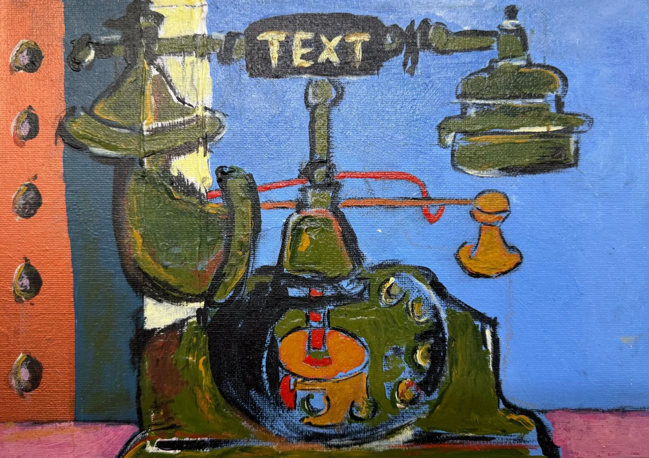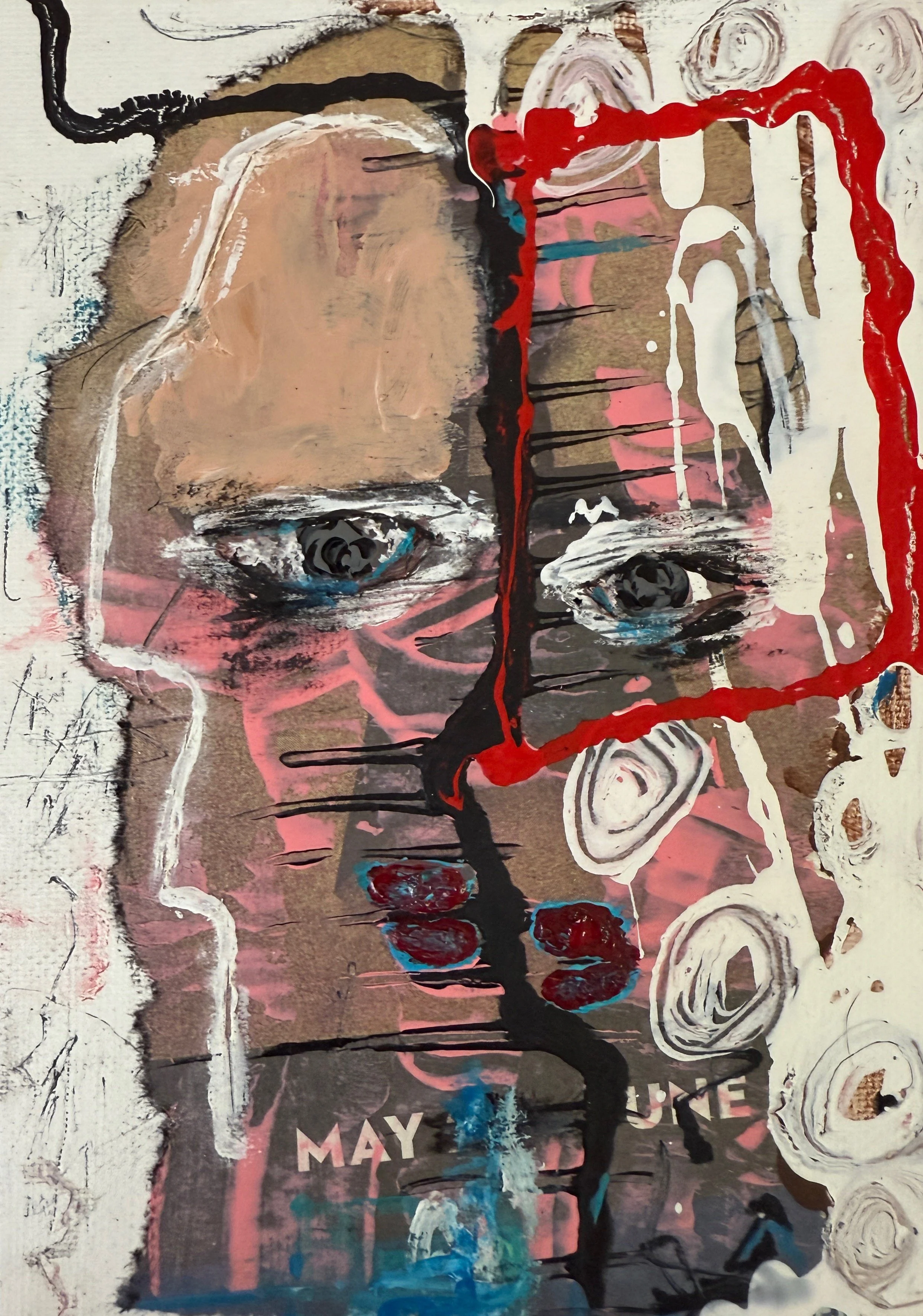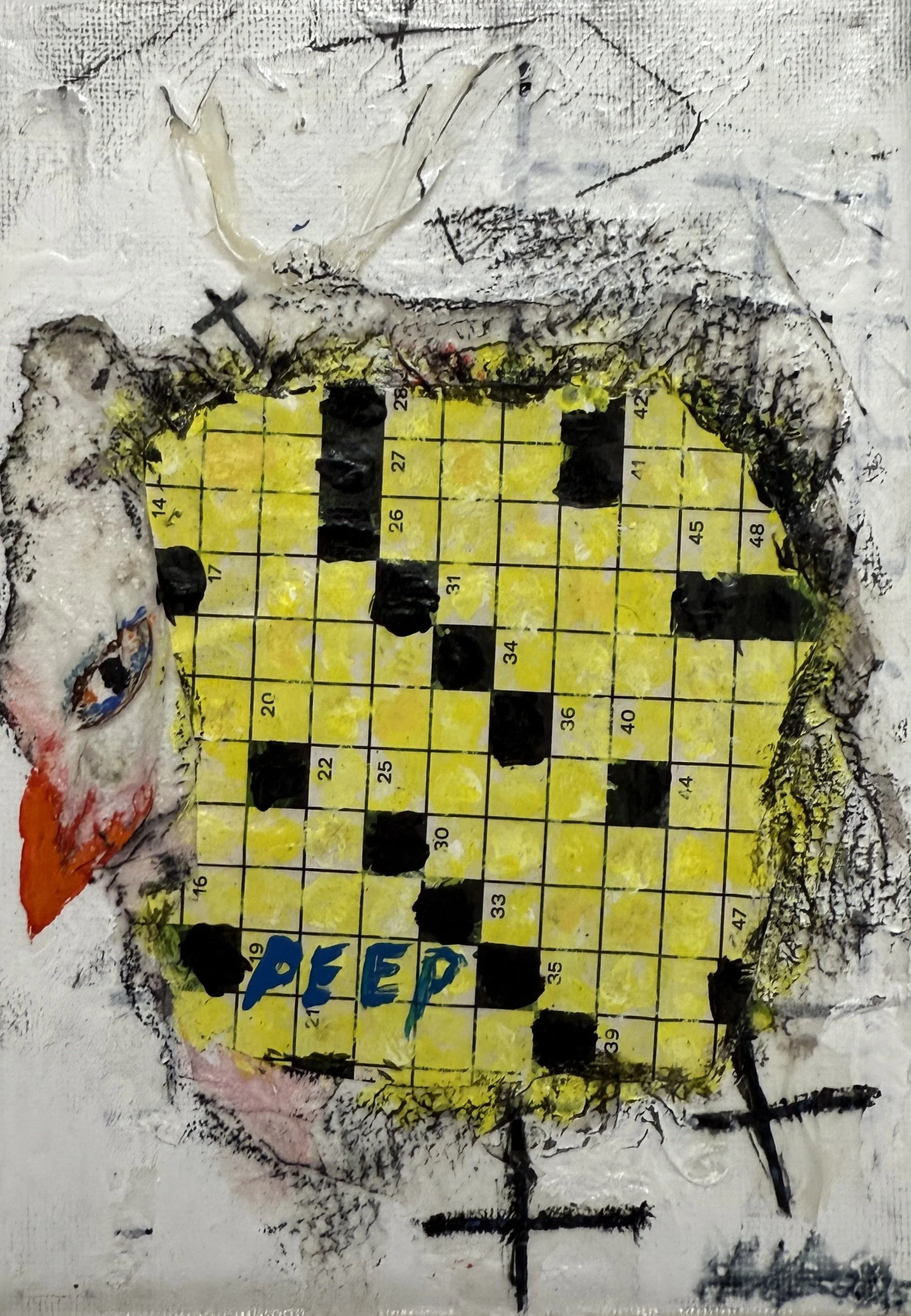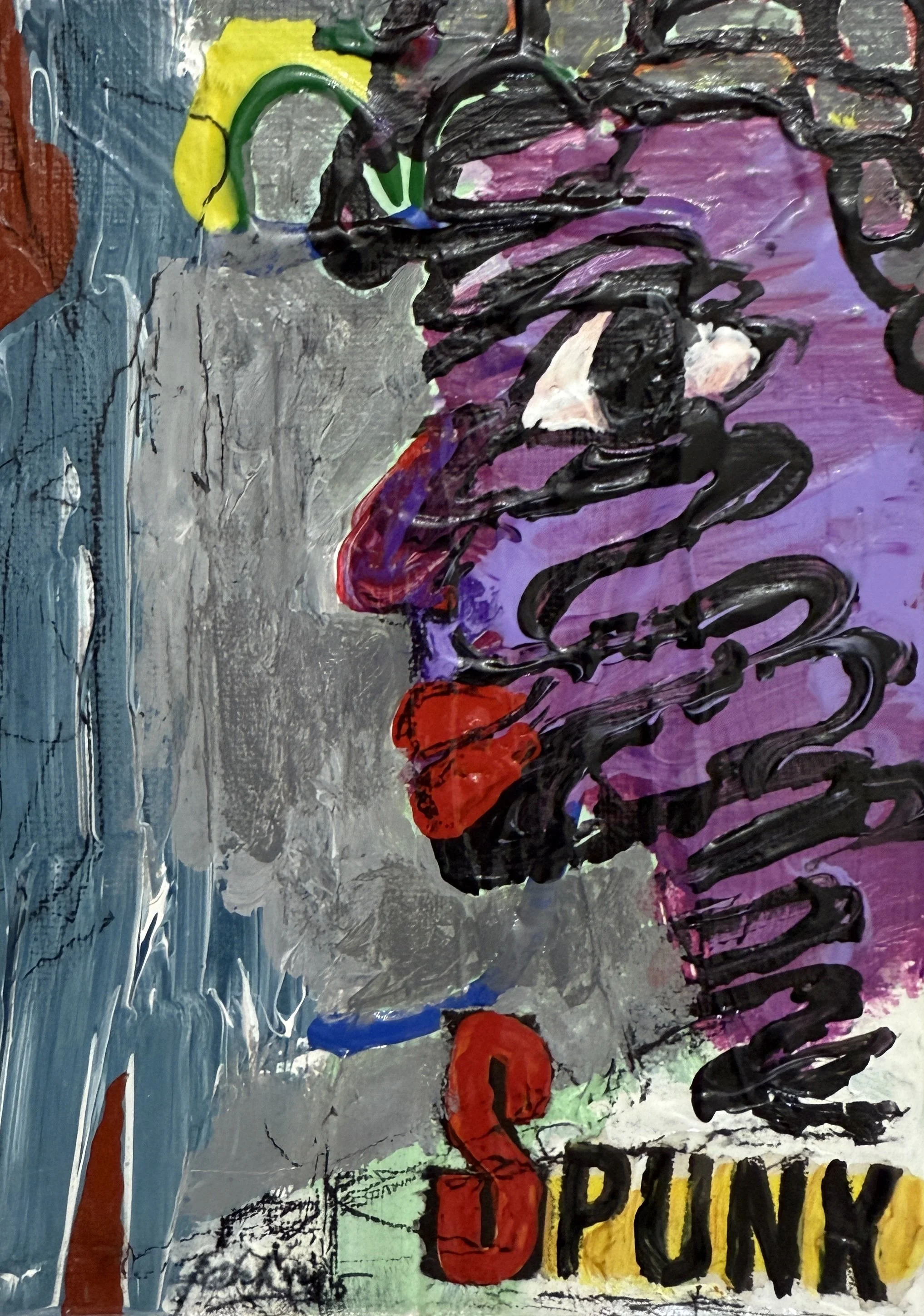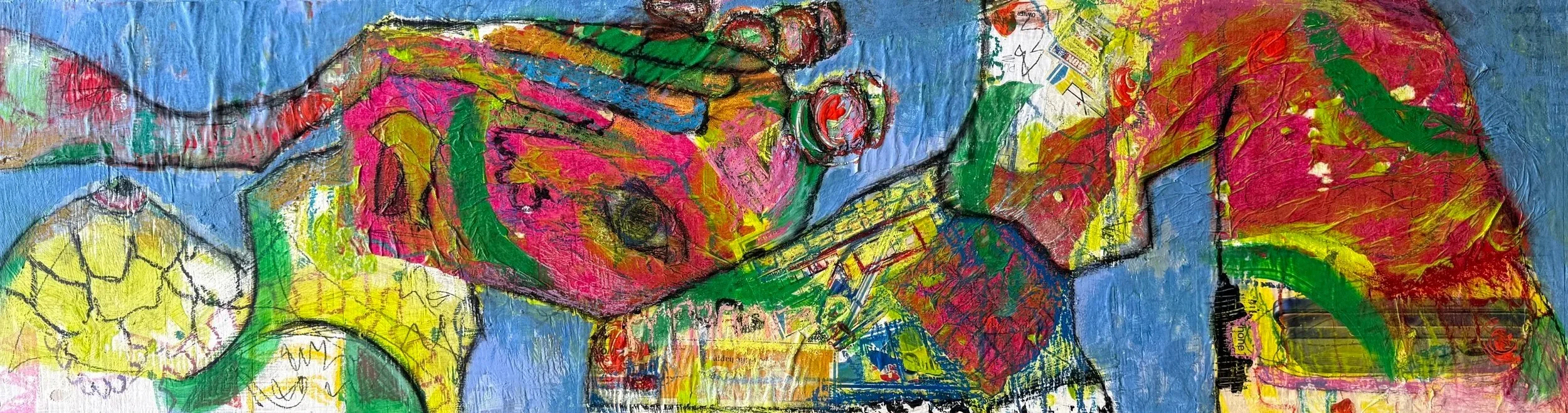 Whether you say “pockuhbook” or “pocketbook”, there is some kind of wonderfulness in pockuhbook-sized things. Intuitive painting on small canvases is such a burst of energy. It zooms me to an unknown land of no expectations; just grab some scrap paper, textured particles, any other random finds…and on your compact surface, let loose!…and the canvas will show itself glad. Painting small is a recharge when I’m in a creative slump, or it’s a vent when I have plenty of mind-sport I want to release on the spot. Unexpected ideas with undirected hands at a satisfying tempo on a smaller canvas move so harmoniously together. This 5inx7in collection of 16 pieces converse about random topics such as tornadoes, cellists, dancing mantises, emus, and more. Yes, they’re small enough to transport in a pockuhbook, but large enough to boost a next round of inspiration.