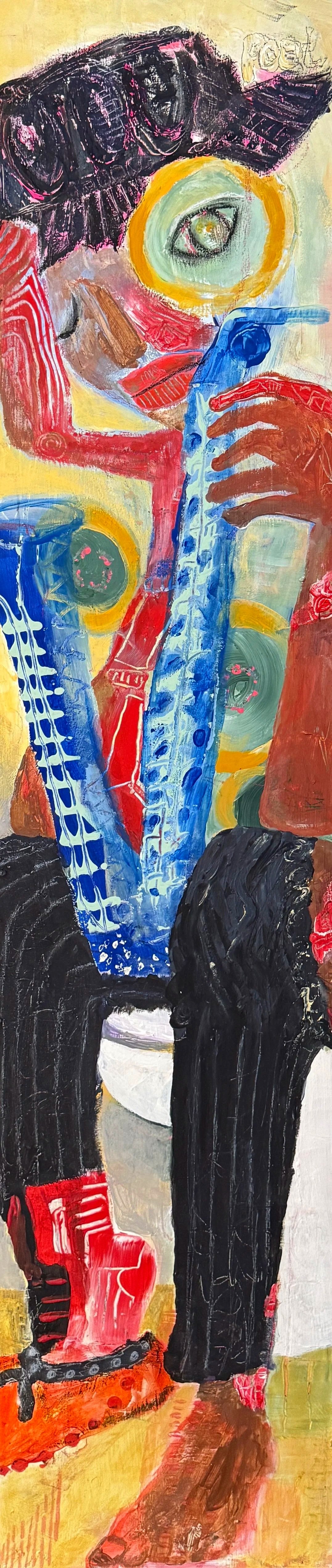 Story: Criticism of self can put anyone in an emotional box or narrow headspace. Self-embracement is wholeheartedly accepting and loving the distinguishing aspects of your identity--strengths and weaknesses—from head to toe. This type of acceptance can develop over time in small volumes and in new kinds of restricted spaces such as solitary walks, therapy offices, and prayer closets. In this painting, Helen shows her contortion and discomfort. The limbs and other parts of Helen that are not painted on canvas represent components of herself that have begun to heal.